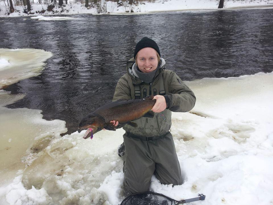 Fiskade Baltak i fredags och efter att ha varit helt dött krokade jag den här på en egenbunden bäcksländeimitation. Fighten tog lång tid och den kändes grymt stark hela tiden. Han hade en  benägenhet att gå och ställa sig på samma ställe ute i strömmen. Ett tag var han på väg att dra iväg nedströms och då trodde jag att det var kört men jag redde ut det till slut med min gode vän Pers hjälp.